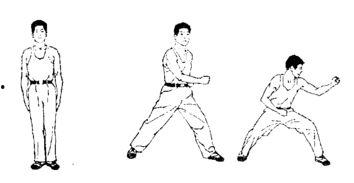 1. 起式:两脚并拢,双手抱拳于腰间,身体挺直,目光向前。这是军体拳的基本站姿,也是所有动作的起点。