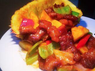 5. 合并翻炒:将炒好的猪肉重新倒入锅中,与菠萝一起翻炒均匀,让每一块肉都裹上菠萝的香甜。
